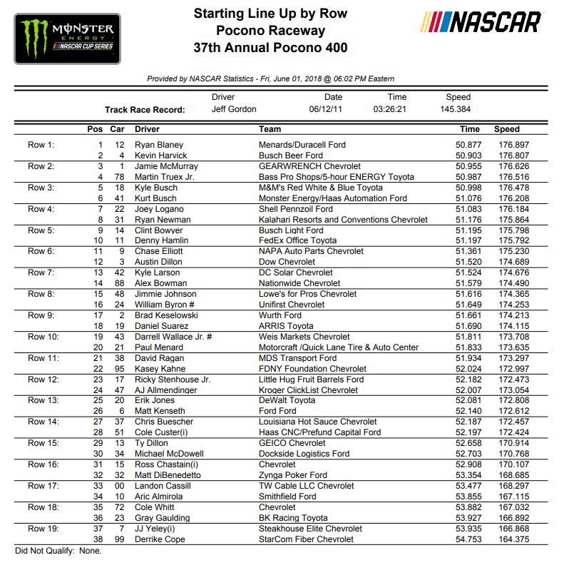 Glenn – We are so glad you enjoyed your Friday at the track! The lineup will be determined following NASCAR Xfinity Series qualifying today at 9:05 a.m. We will be sure to post the starting lineup to our website.